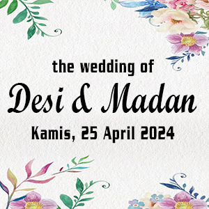 THE WEDDING Desi & Madan Kamis, 25 April 2024 SAVE THE DATE Maha Suci Allah SWT Yang telah menciptakan makhlukNya berpasang-pasangan. Ya Allah, perkenankanlah dan Ridhoilah putra-putri kami : Desi Ariani Putri, S.Pd Ramadhan Iftianda Putra Fauziah Ratnasari Putra dari Bapak Dabarin (Alm) dan Ibu Jaminar (Almh) Untuk mengikuti Sunnah Rasul-Mu dalam rangka membentuk keluarga […]